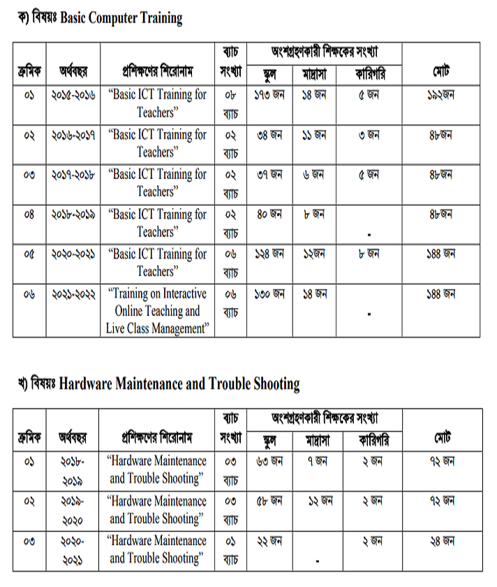| ০৫ | ২০২০-২০২১ | “Basic ICT Training for Teachers” | ০৬ ব্যাচ | ১২৪ জন | ১২জন